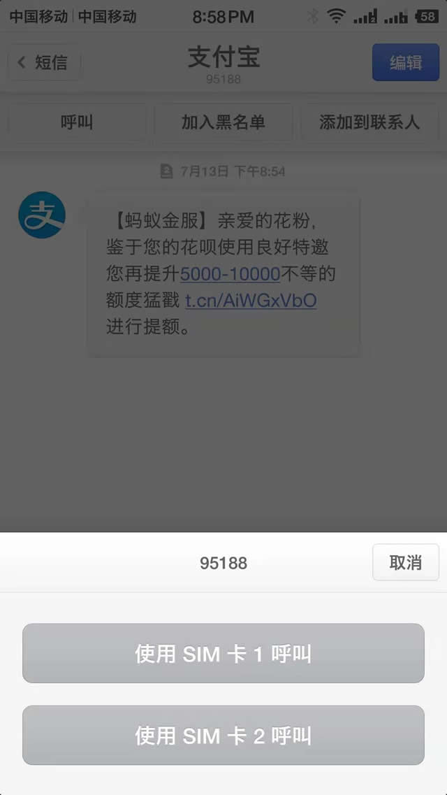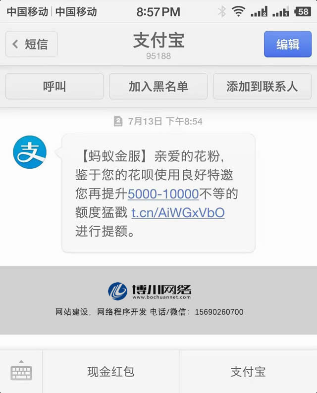 事件是這樣的:晚上8點(diǎn)54分的時(shí)候,忽然收到一條來(lái)自支付寶的短信,短信內(nèi)容為花唄的額度提額。