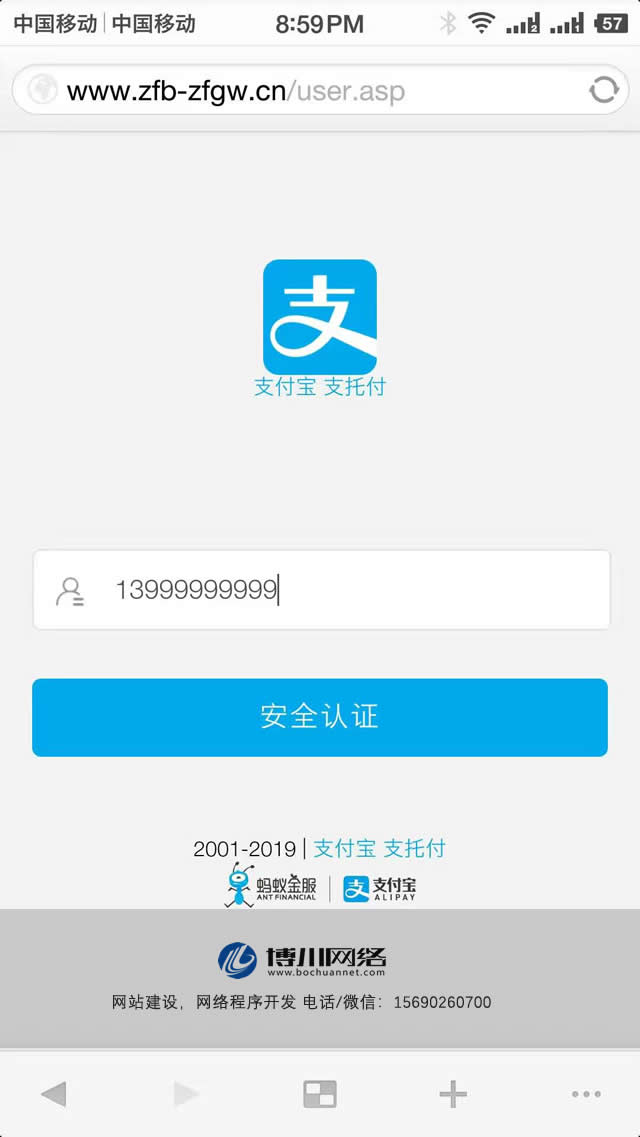其實(shí)對(duì)于絕大多數(shù)的人來(lái)說(shuō),看到這里,也不會(huì)有任何的懷疑,因?yàn)榇蜷_(kāi)的網(wǎng)頁(yè)的配色、括字體、圖片和各種細(xì)節(jié)基本上和支付寶官方網(wǎng)站一樣。 但是對(duì)于博川來(lái)說(shuō),點(diǎn)開(kāi)網(wǎng)頁(yè)后的第一眼,就已經(jīng)判定這是一個(gè)釣魚網(wǎng)站了! 為了讓大家看的更加清楚,我們把下面的流程走完:上面的支付寶賬號(hào)那里,博川隨便輸入了一個(gè)假的手機(jī)號(hào)碼,直接進(jìn)入下一個(gè)頁(yè)面。